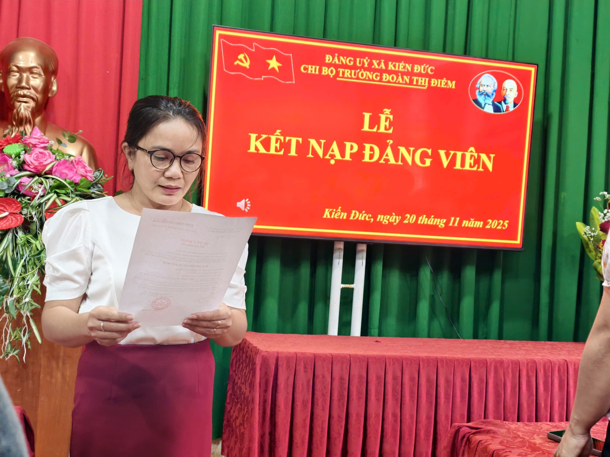 Hôm nay, ngày 20/11/2025, Chi bộ Trường Tiểu học Đoàn Thị Điểm đã long trọng tổ chức Lễ kết nạp Đảng cho đồng chí Phan Thị Lệ Hằng. Đồng chí Phan Thị Lệ Hằng là quần chúng ưu tú, luôn thể hiện tinh thần trách nhiệm, phẩm chất đạo đức tốt và hoàn thành xuất sắc nhiệm vụ được giao. Qua quá trình phấn đấu và rèn luyện, đồng chí đã nhận thức rõ về mục tiêu, lý tưởng của Đảng và tự nguyện viết đơn xin vào Đảng Cộng sản Việt Nam.