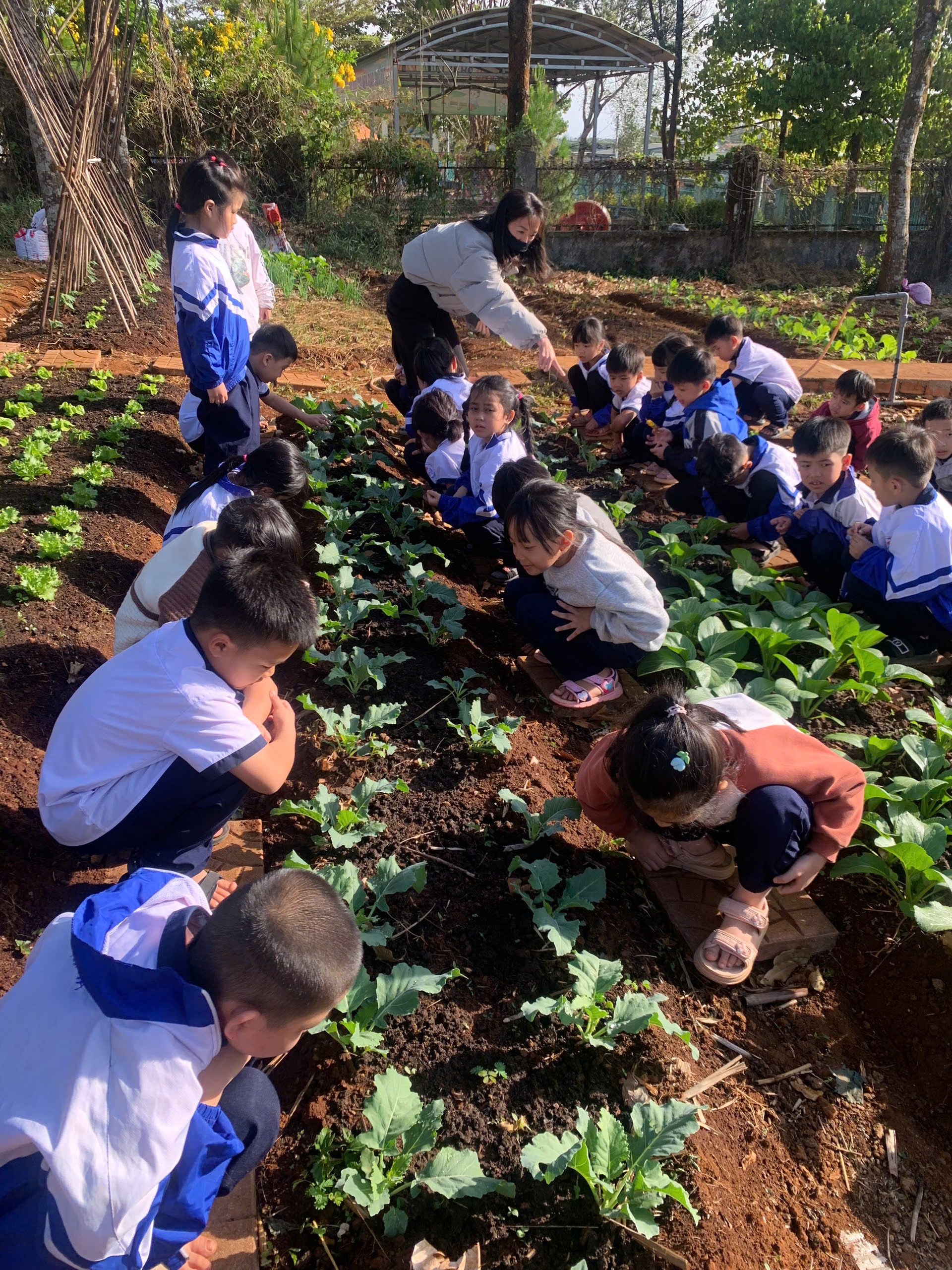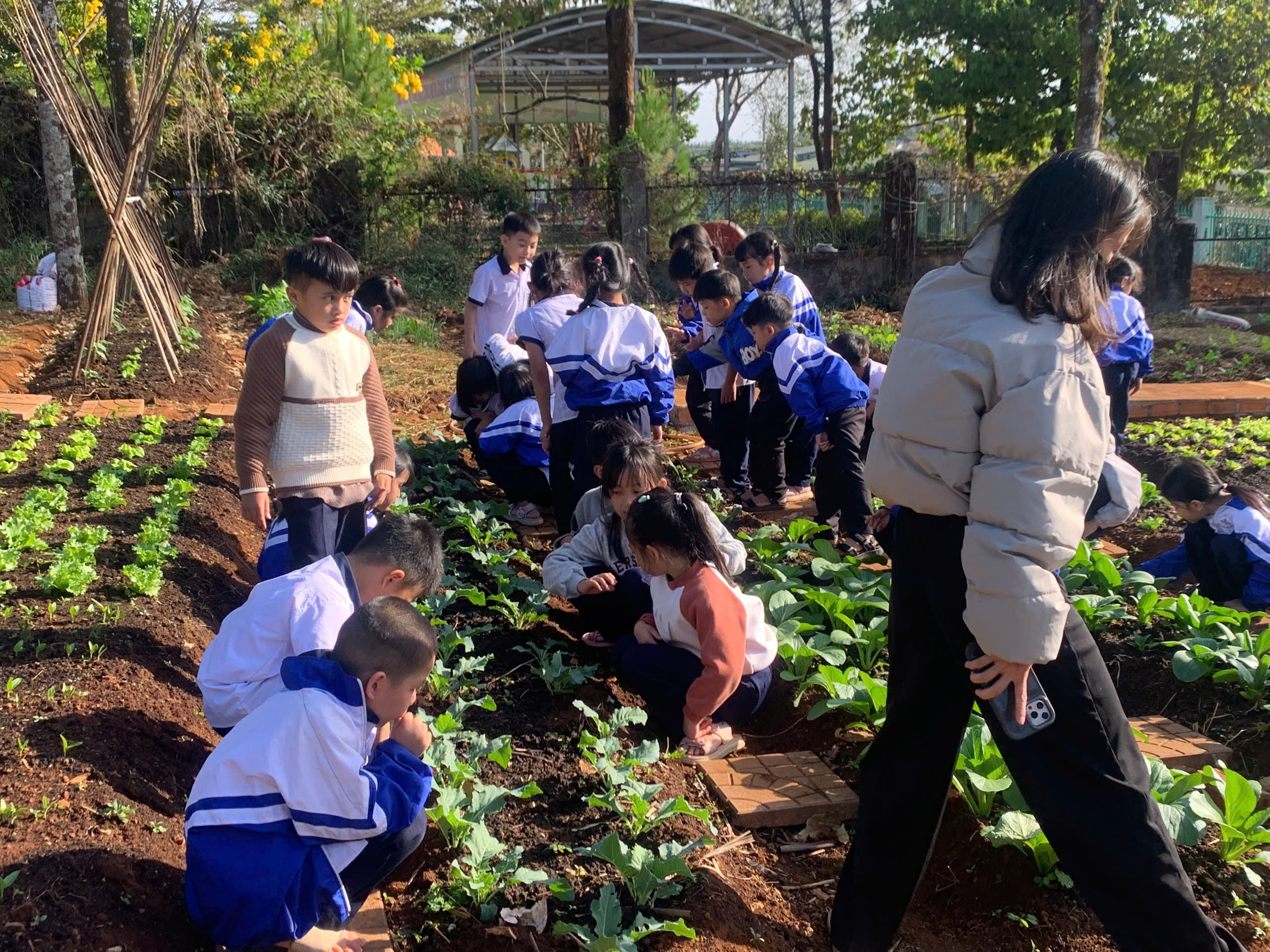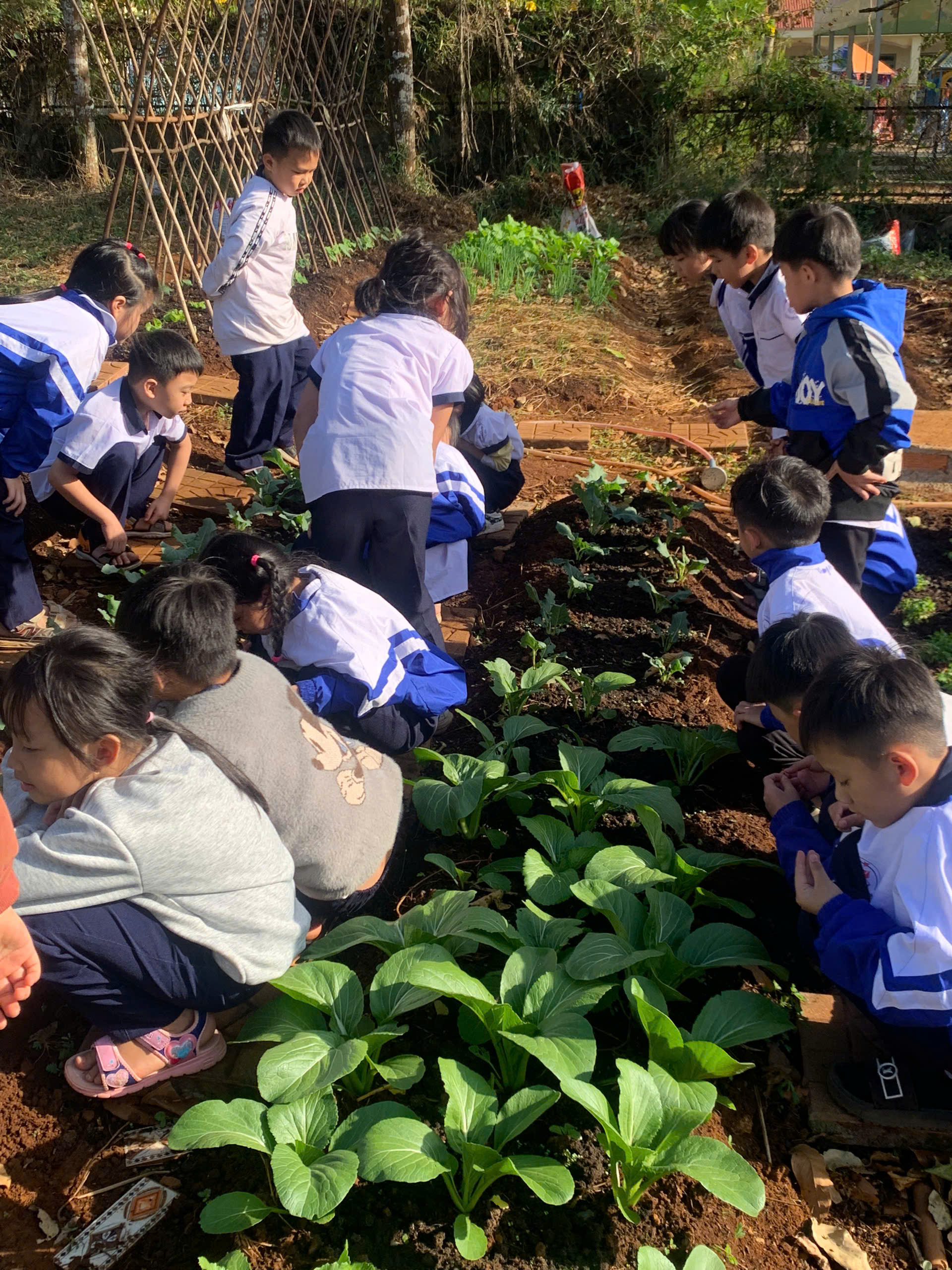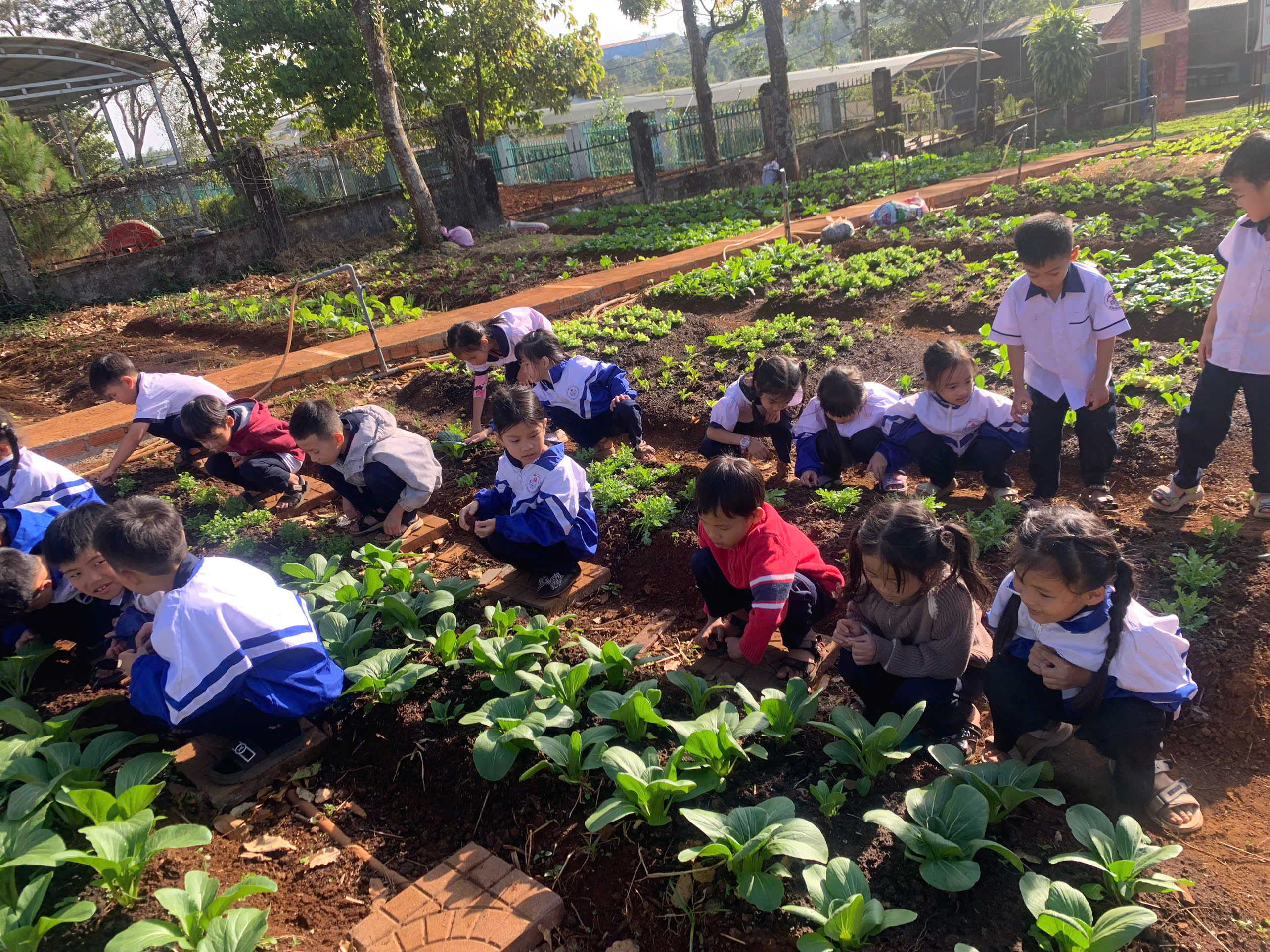 Tại khu vực “Vườn rau em chăm”, những luống cải xanh mướt, xà lách và hành ngò được các em tự tay xới đất, nhổ cỏ và tưới nước. Đây không chỉ là hoạt động lao động đơn thuần mà còn là tiết học thực hành sinh động về lòng yêu lao động và trân trọng thành quả mình làm ra.