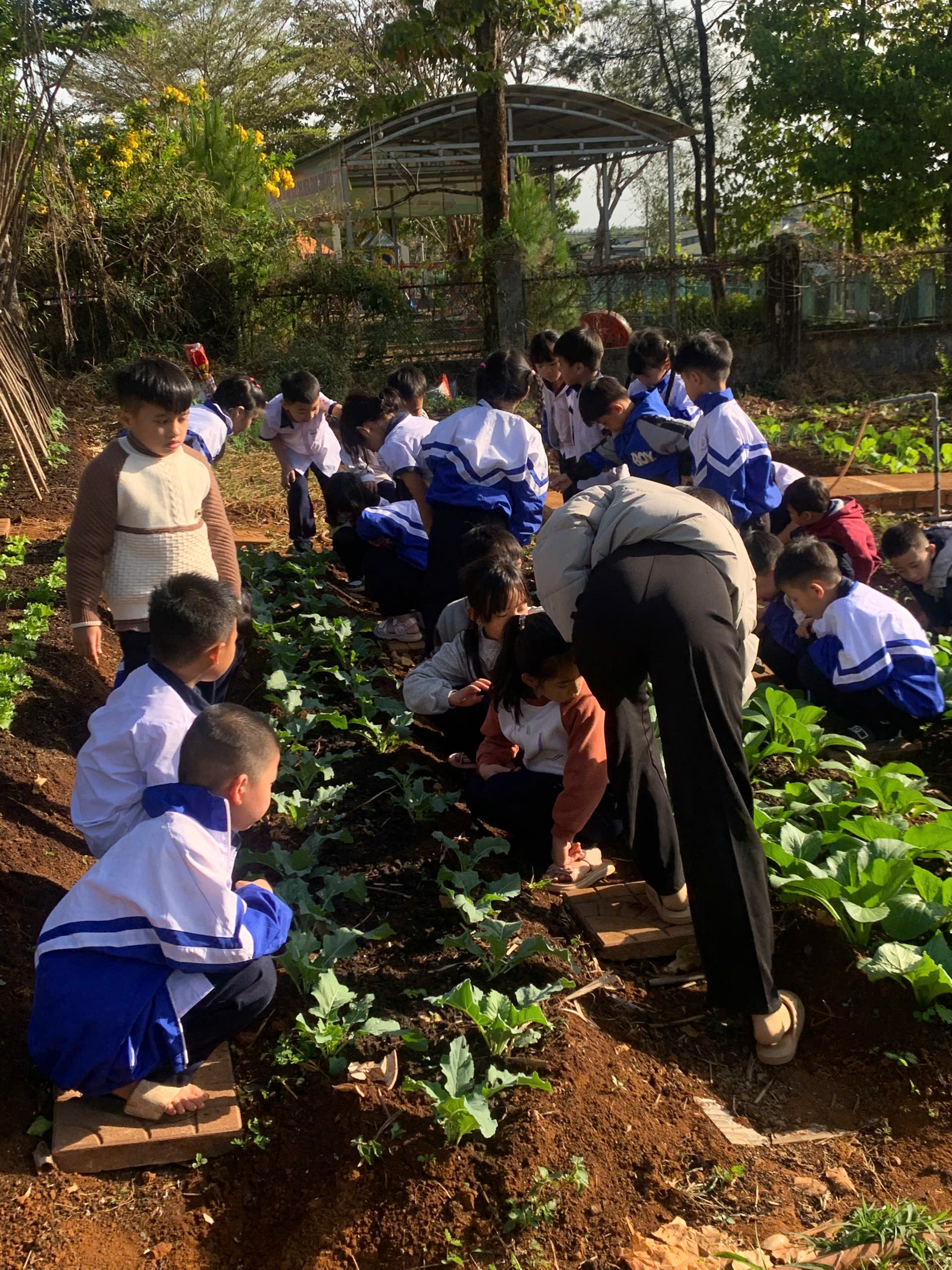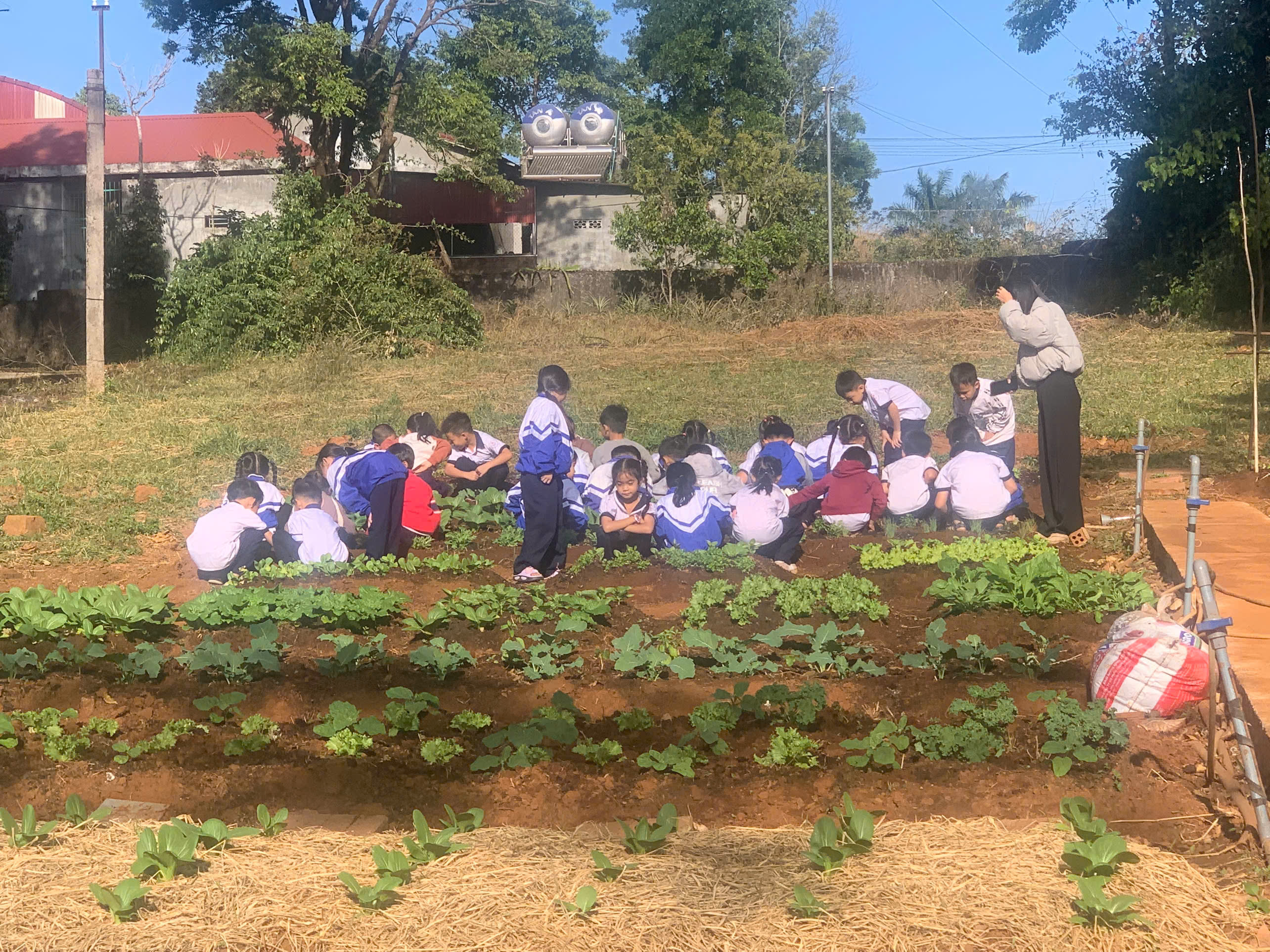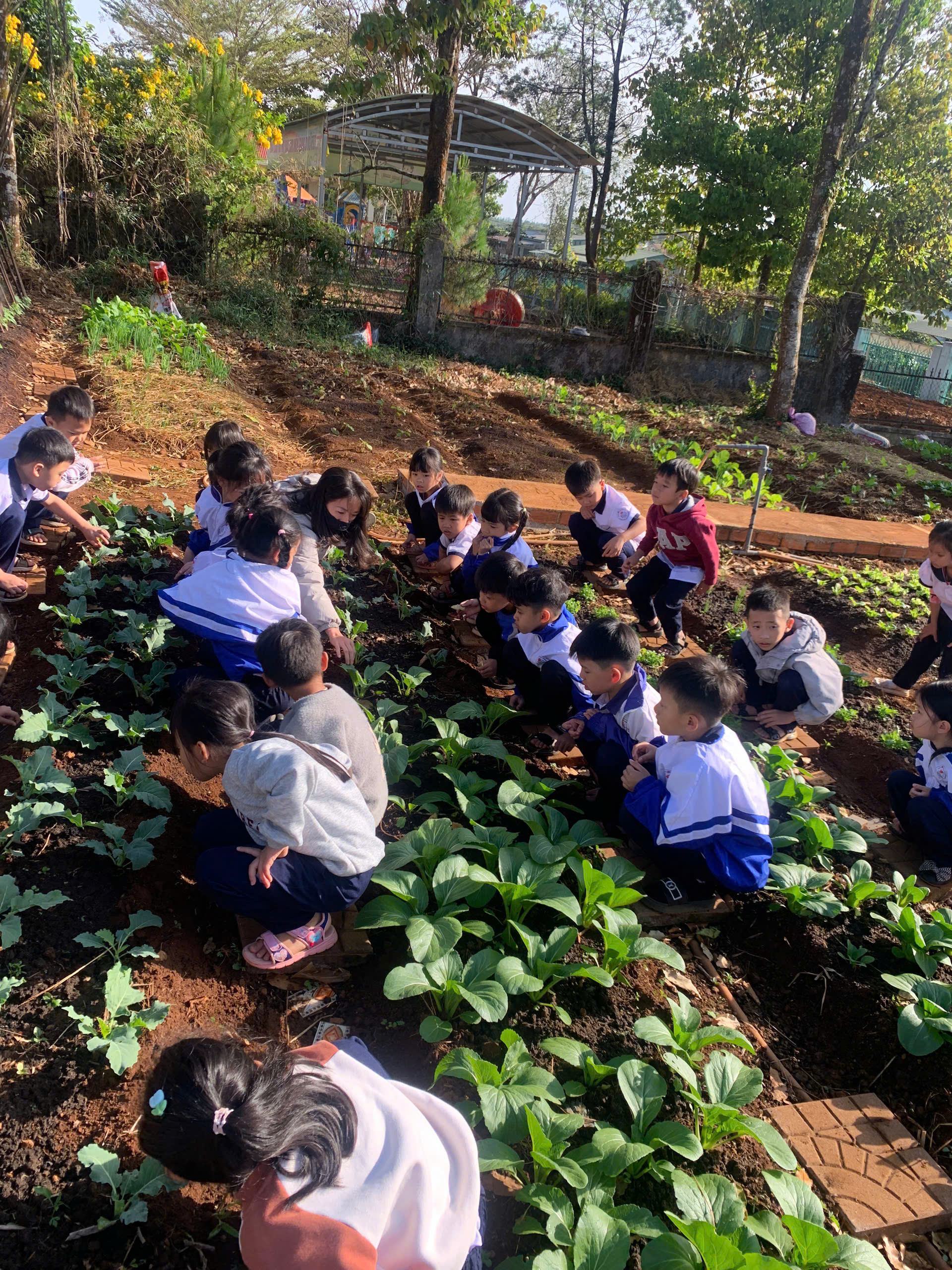 Tại khu vực “Vườn rau em chăm”, những luống cải xanh mướt, xà lách và hành ngò được các em tự tay xới đất, nhổ cỏ và tưới nước. Đây không chỉ là hoạt động lao động đơn thuần mà còn là tiết học thực hành sinh động về lòng yêu lao động và trân trọng thành quả mình làm ra.