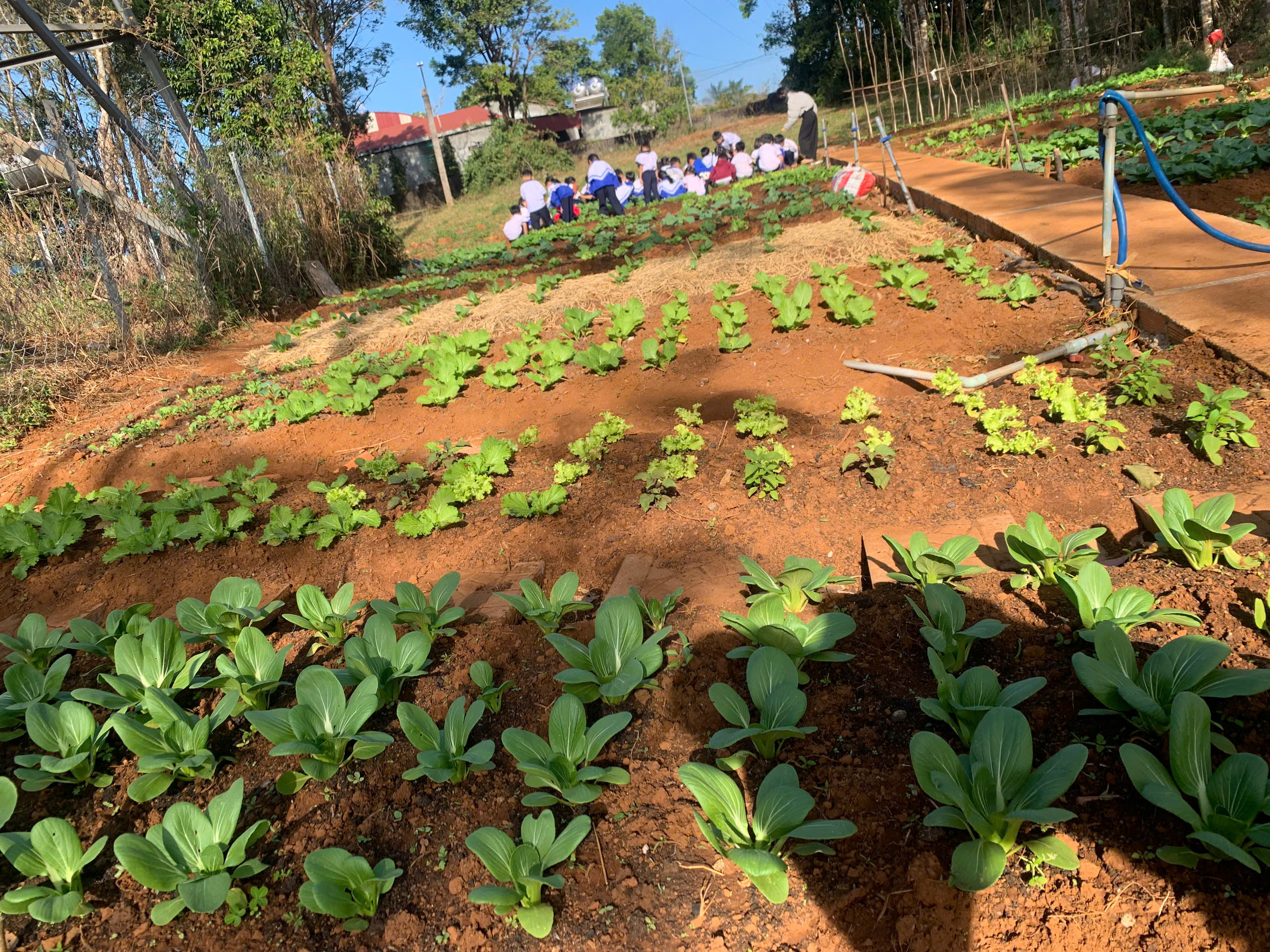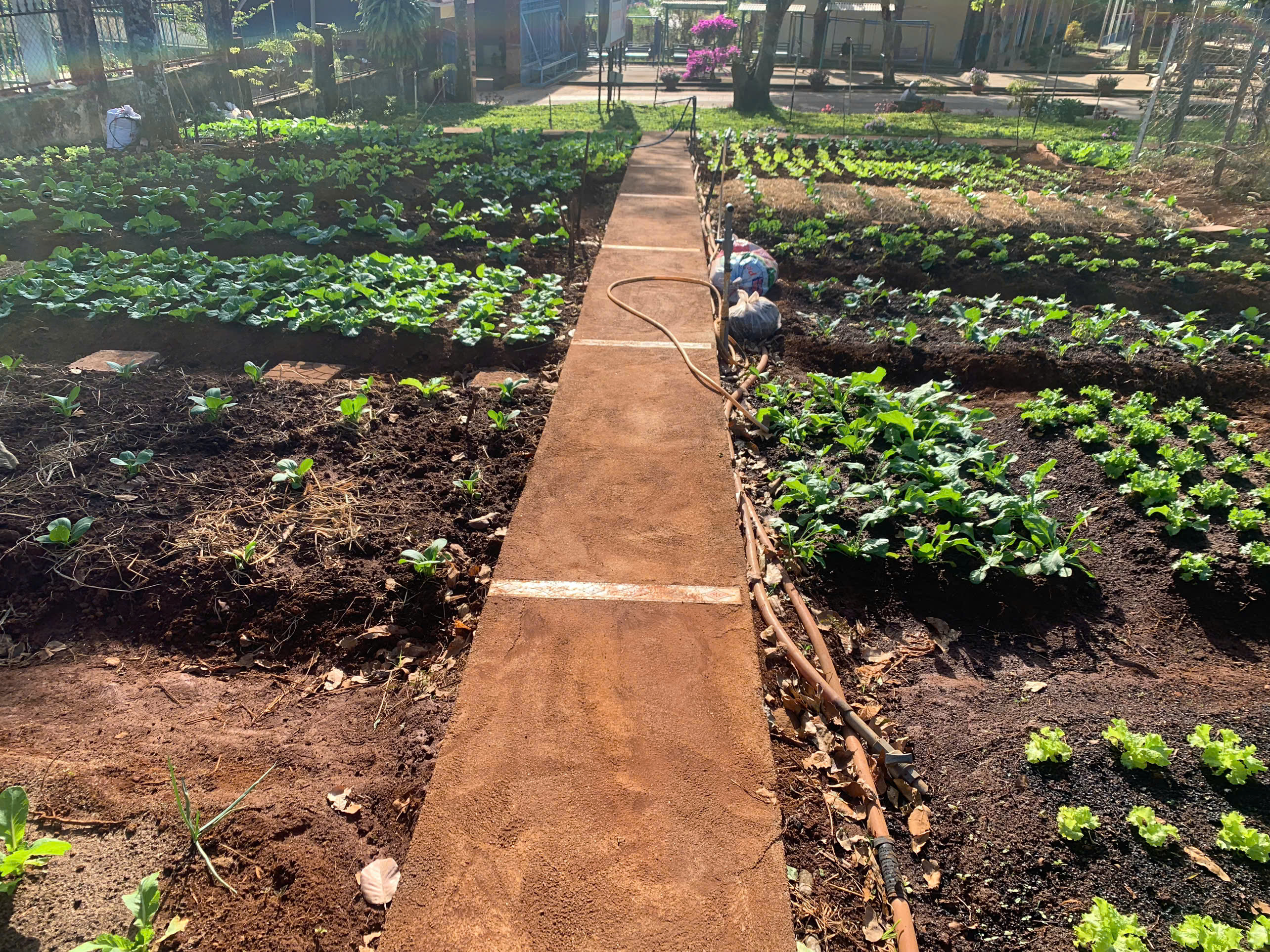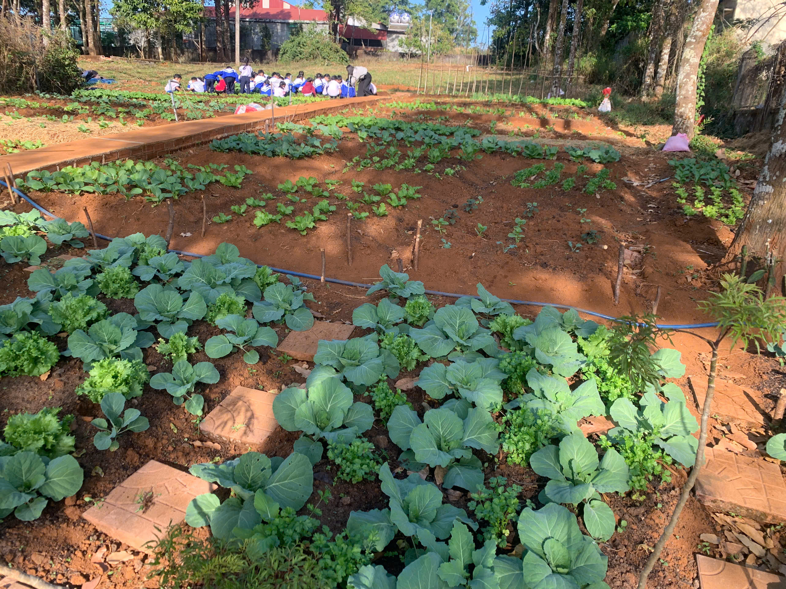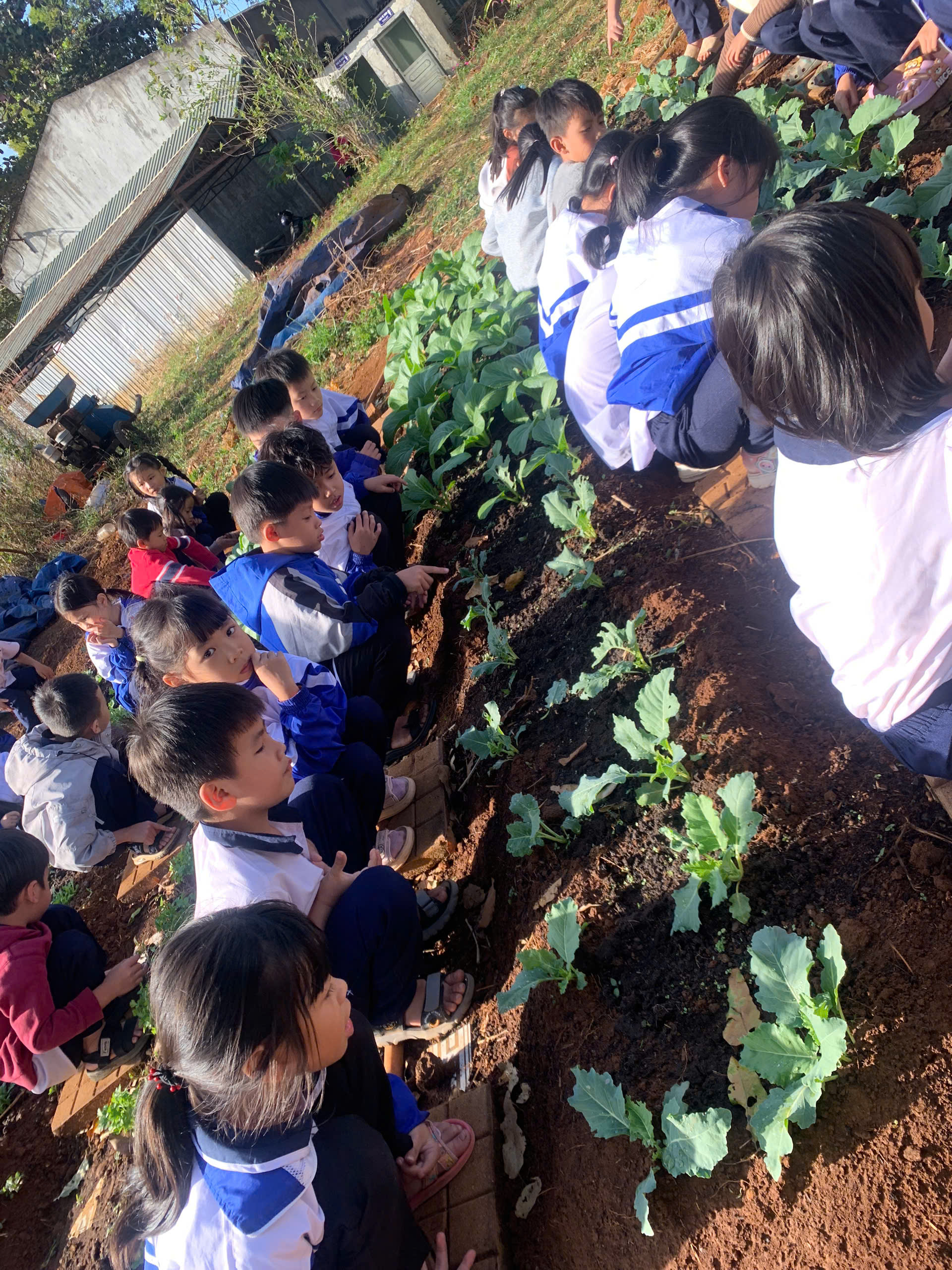 Tại khu vực “Vườn rau em chăm”, những luống cải xanh mướt, xà lách và hành ngò được các em tự tay xới đất, nhổ cỏ và tưới nước. Đây không chỉ là hoạt động lao động đơn thuần mà còn là tiết học thực hành sinh động về lòng yêu lao động và trân trọng thành quả mình làm ra.