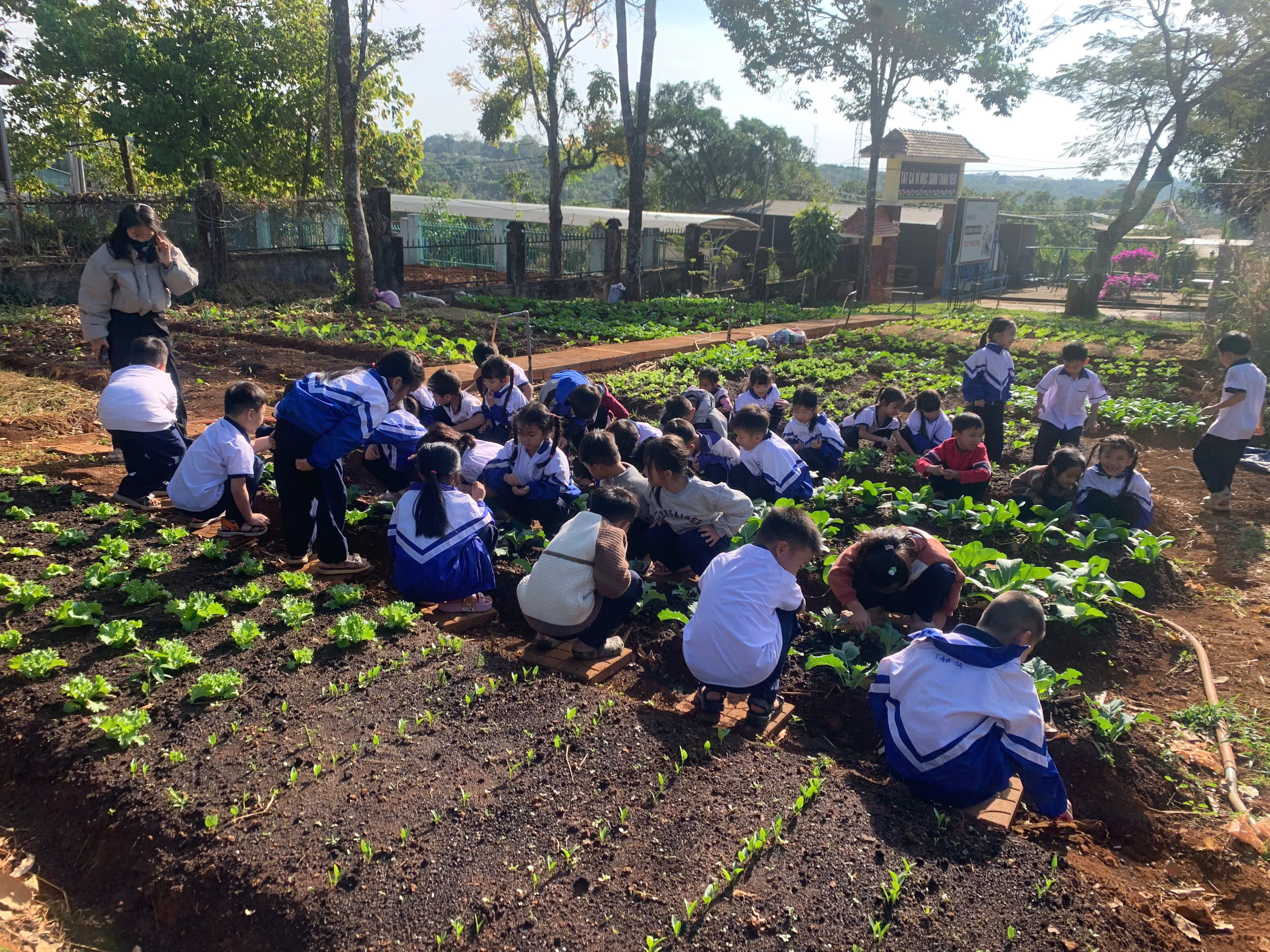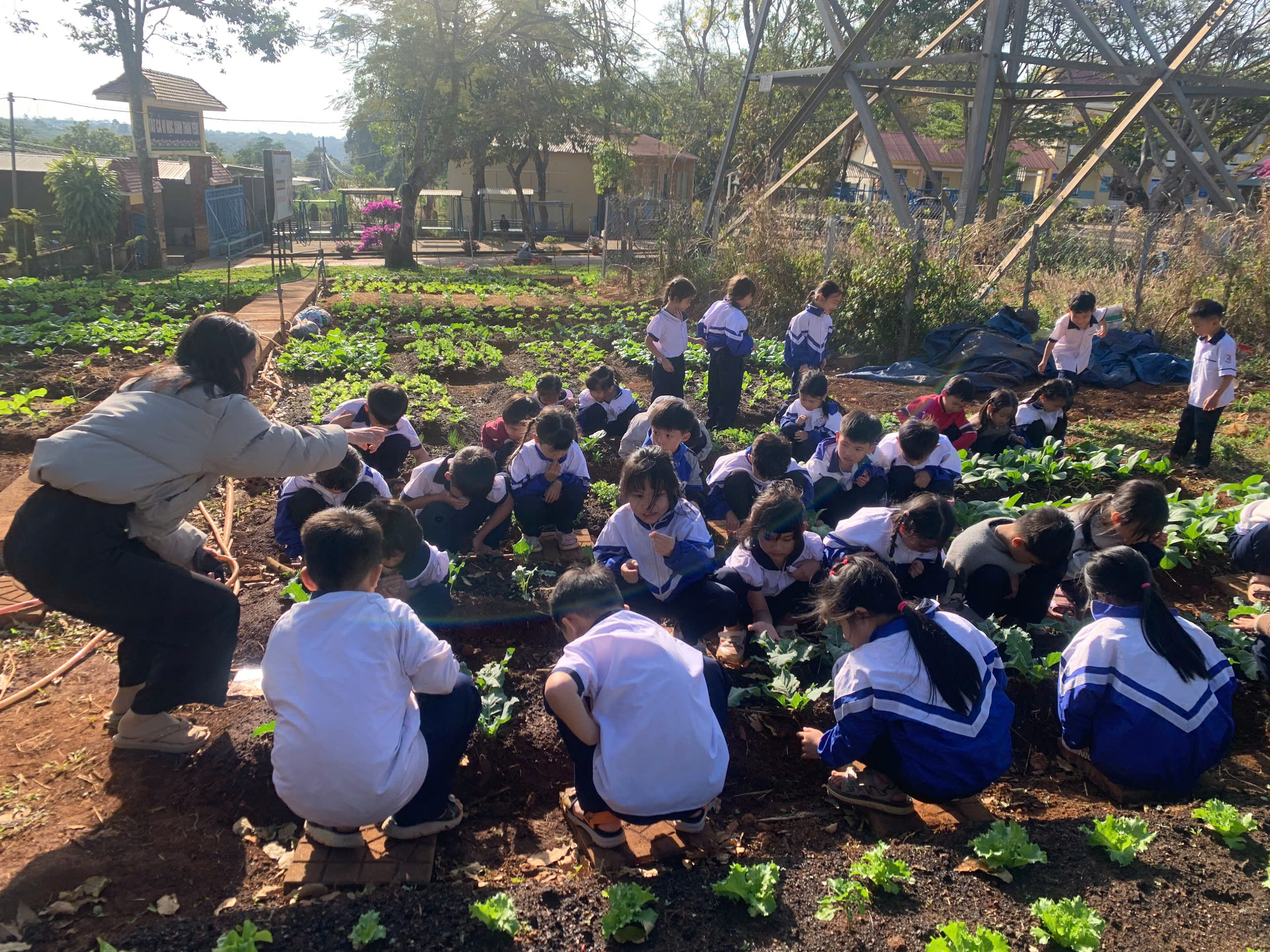 Ngay từ sáng sớm, khuôn viên trường Tiểu học Đoàn Thị Điểm đã rộn ràng tiếng cười nói. Không còn bó hẹp trong những trang sách, các em học sinh từ khối 1 đến khối 5 đã thực sự hóa thân thành những “nông dân nhí” thực thụ.