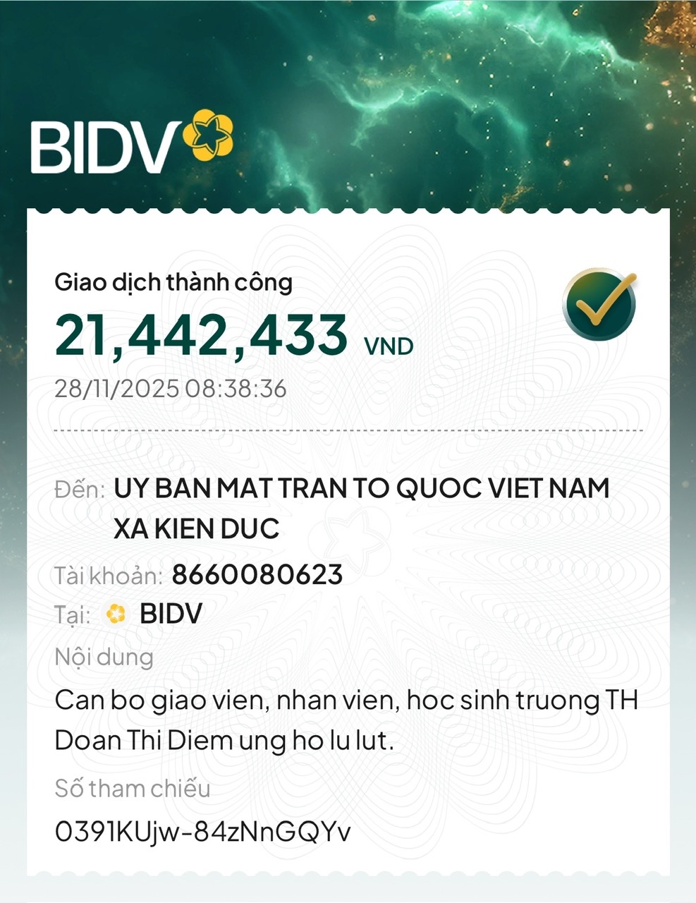 Hưởng ứng thư kêu gọi của Ủy ban Mặt trận Tổ quốc Việt Nam xã Kiến Đức, tỉnh Lâm Đồng về việc chung tay hỗ trợ đồng bào bị ảnh hưởng nặng nề bởi cơn bão số 13 và 14, tập thể cán bộ, giáo viên, nhân viên và học sinh Trường Tiểu học Đoàn Thị Điểm đã tích cực tham gia phong trào quyên góp với tinh thần “tương thân tương ái”.