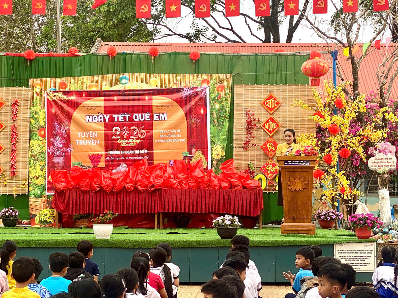 Hòa chung không khí vui tươi, phấn khởi của mùa xuân mới và chào mừng Đảng Cộng sản Việt Nam quang vinh, sáng ngày 05/02/2026, Trường Tiểu học Đoàn Thị Điểm – xã Kiến Đức, tỉnh Lâm Đồng đã phối hợp cùng Tổ chức Tầm nhìn thế giới (World Vision International) tổ chức chương trình “Hội xuân thiếu nhi – Mừng Đảng quang vinh – Mừng xuân Bính Ngọ” dành cho các em học sinh toàn trường.