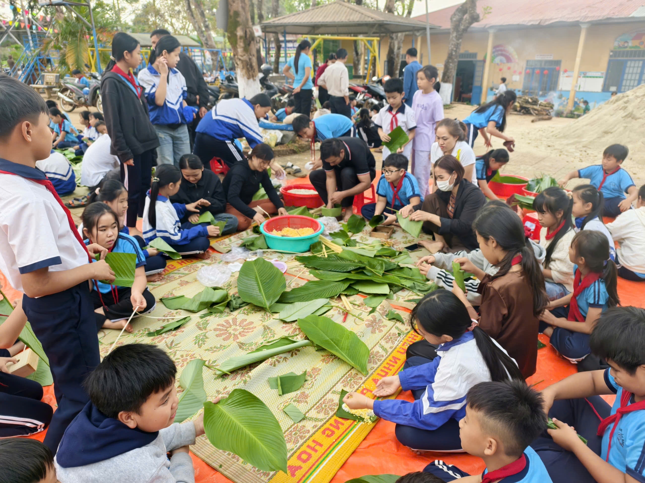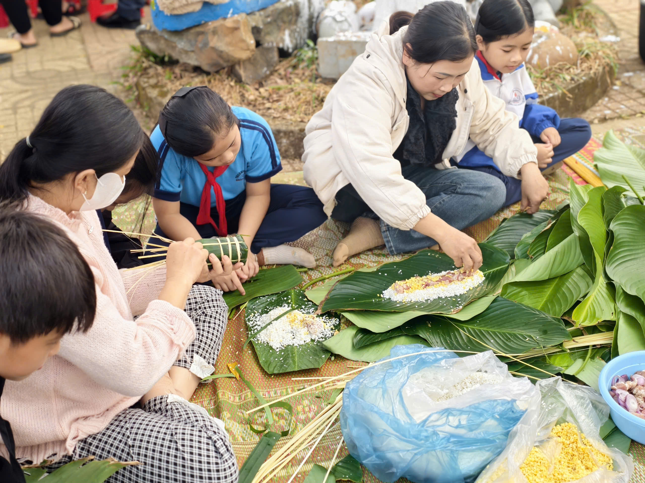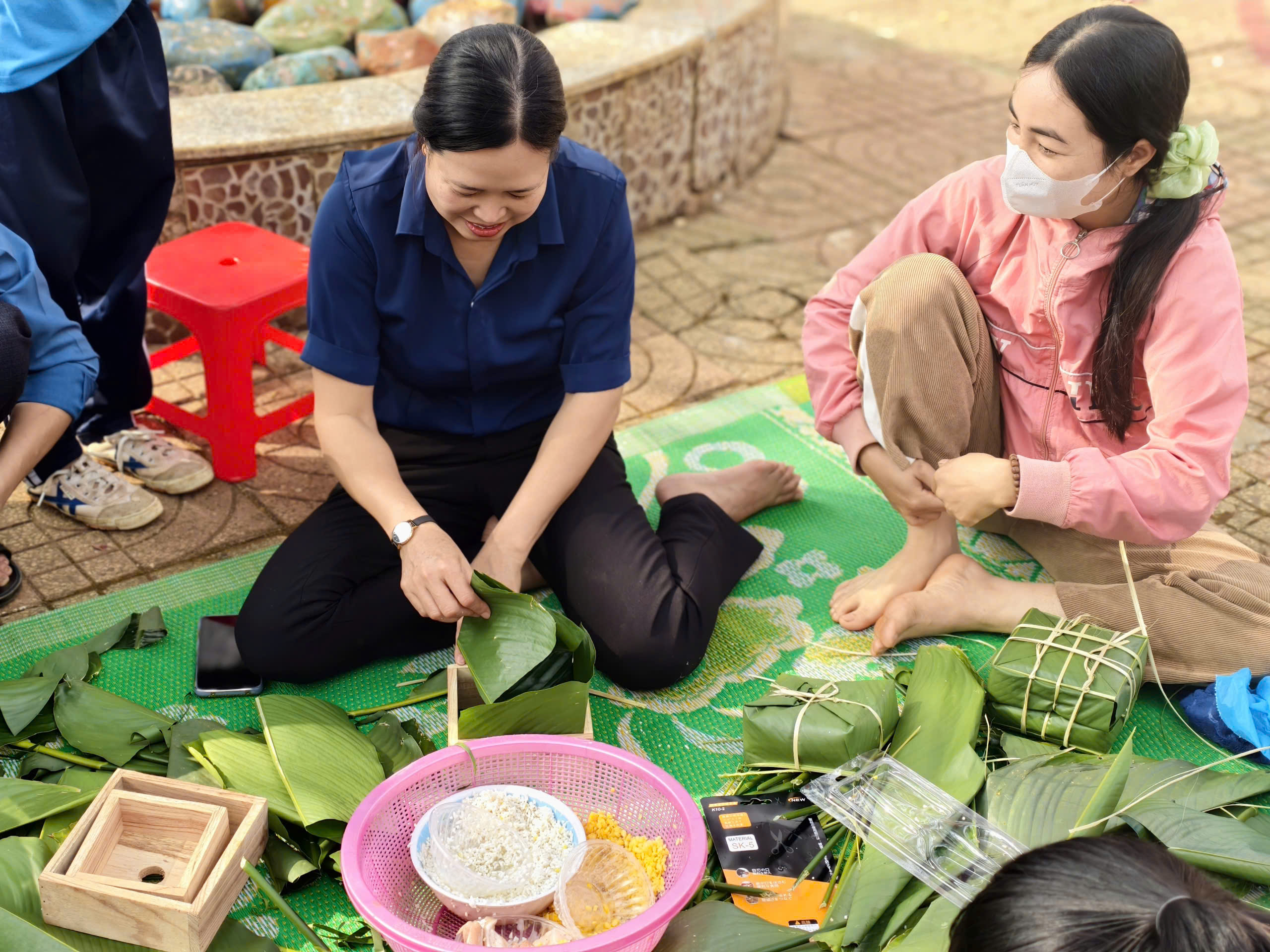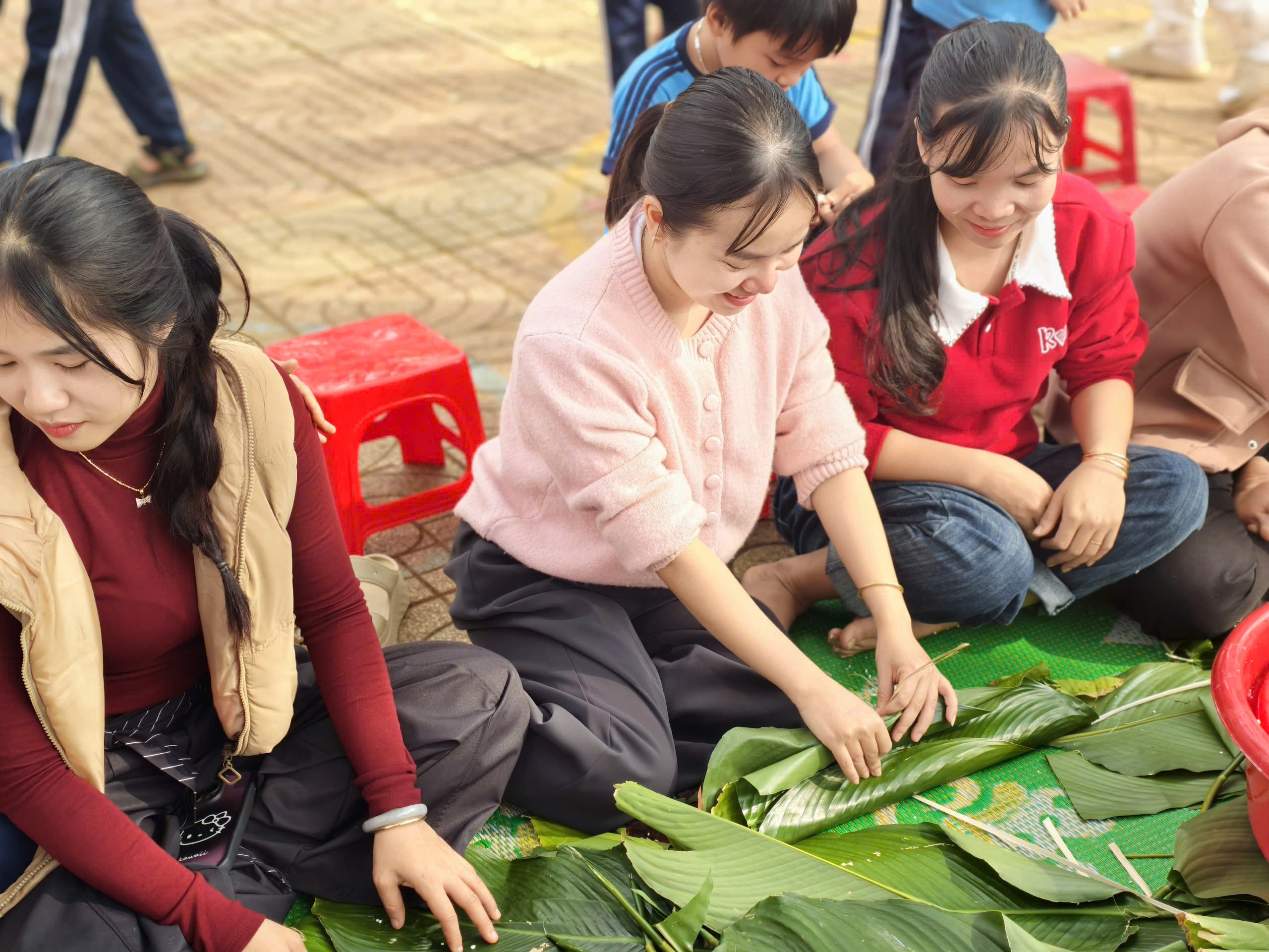 Tiếp nối chương trình là hoạt động trải nghiệm gói bánh chưng, bánh tét và làm mứt Tết. Dưới sự hướng dẫn của thầy cô giáo và các anh chị tình nguyện viên, các em học sinh được trực tiếp tham gia các công đoạn làm bánh, tìm hiểu ý nghĩa của bánh chưng, bánh tét trong ngày Tết cổ truyền. Hoạt động không chỉ giúp các em hiểu thêm về nét đẹp văn hóa dân tộc mà còn tạo không khí vui tươi, gắn kết, để lại nhiều kỷ niệm đáng nhớ trong những ngày xuân.