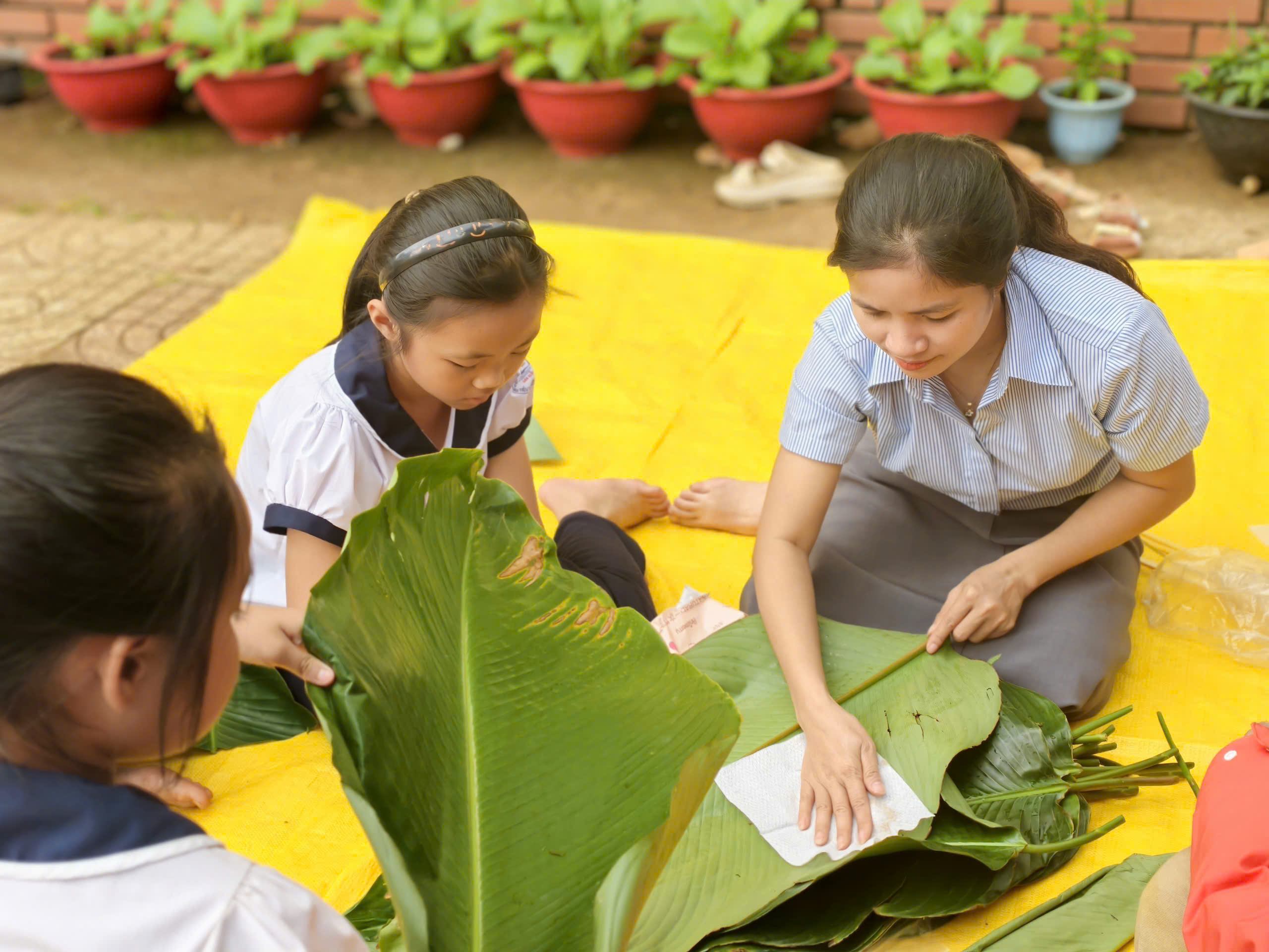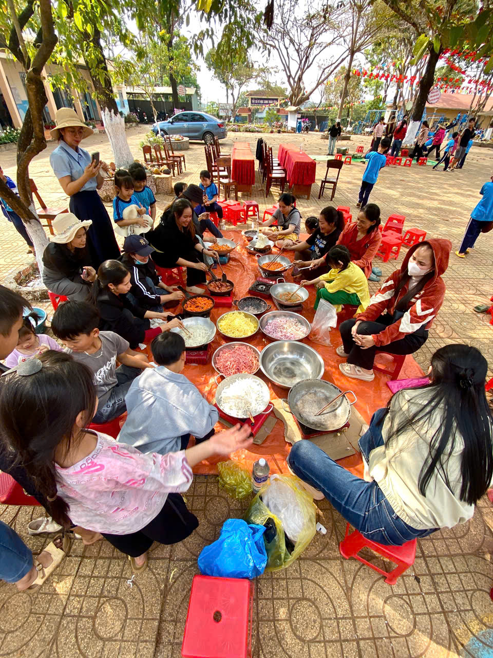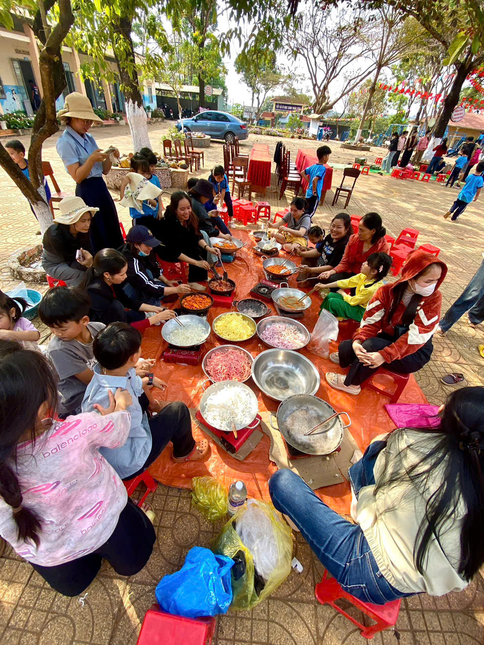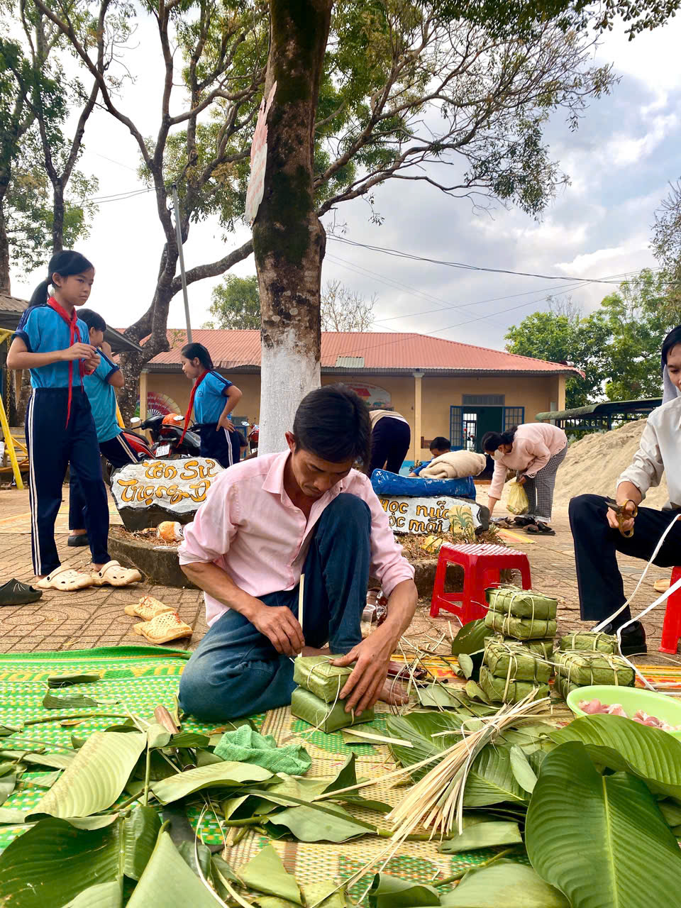 Tiếp nối chương trình là hoạt động trải nghiệm gói bánh chưng, bánh tét và làm mứt Tết. Dưới sự hướng dẫn của thầy cô giáo và các anh chị tình nguyện viên, các em học sinh được trực tiếp tham gia các công đoạn làm bánh, tìm hiểu ý nghĩa của bánh chưng, bánh tét trong ngày Tết cổ truyền. Hoạt động không chỉ giúp các em hiểu thêm về nét đẹp văn hóa dân tộc mà còn tạo không khí vui tươi, gắn kết, để lại nhiều kỷ niệm đáng nhớ trong những ngày xuân.